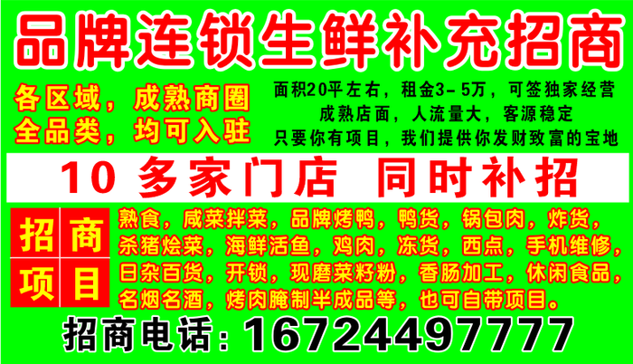 招商项目:熟食,咸菜拌菜,品牌烤鸭,鸭货,锅包肉,炸货,杀猪烩菜,海鲜活鱼,鸡肉,冻货,西点,手机维修,日杂百货,开锁,现磨菜籽粉,香肠加工,休闲食品,名烟名酒,烤肉腌制半成品等,也可自带项目