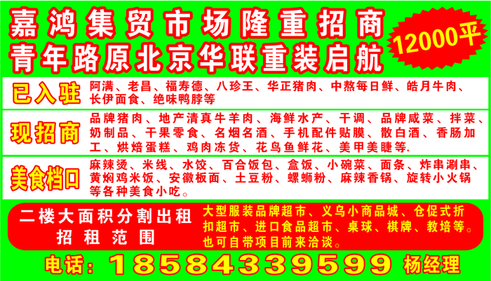 现招商:品牌猪肉、地产清 真牛羊肉、海鲜水产、干调、品牌咸菜、拌菜、奶制品、干果零食、名烟名酒、手机配件贴膜、散白酒、香肠加工、烘焙蛋糕、鸡肉冻货、花鸟鱼鲜花、美甲美睫等
