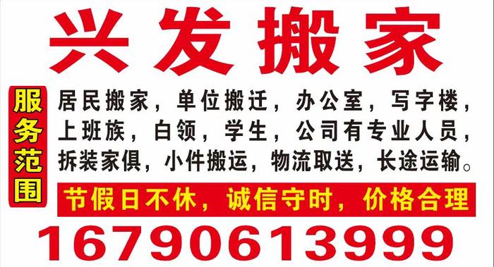 居民搬家,单位搬迁,办公室,写字楼,上班族,白领,学生,公司有专业人员,拆装家俱,小件搬运,物流取送,长途运输,节假日不休,诚信守时,价格合理。
